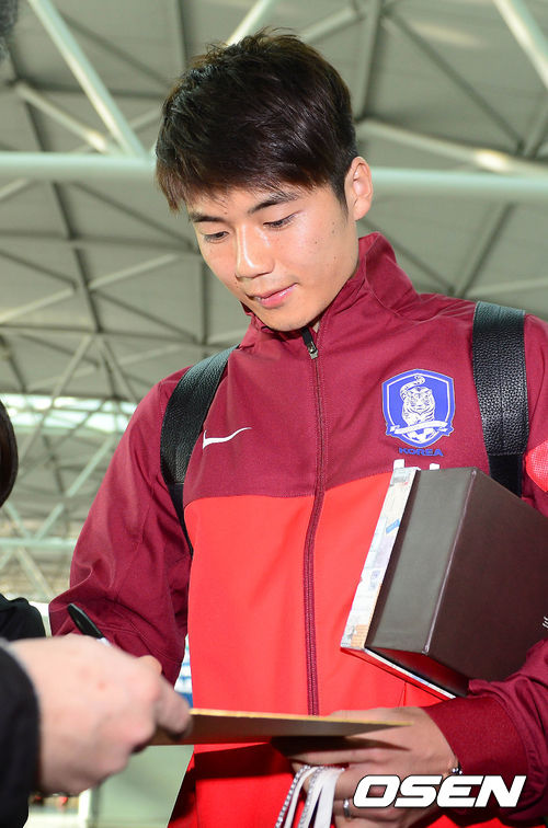 16일 오후 인천국제공항을 통해 두바이로 출국하는 대표팀 기성용이 팬들에게 사인을 해주고 있다.