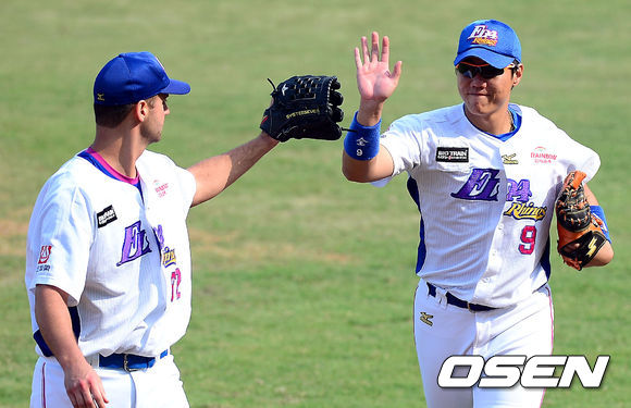 6회말 1사 1루 EDA 라이노스 린이취앤이 위기를 넘긴 토라맷과 하이파이브를 하고 있다.