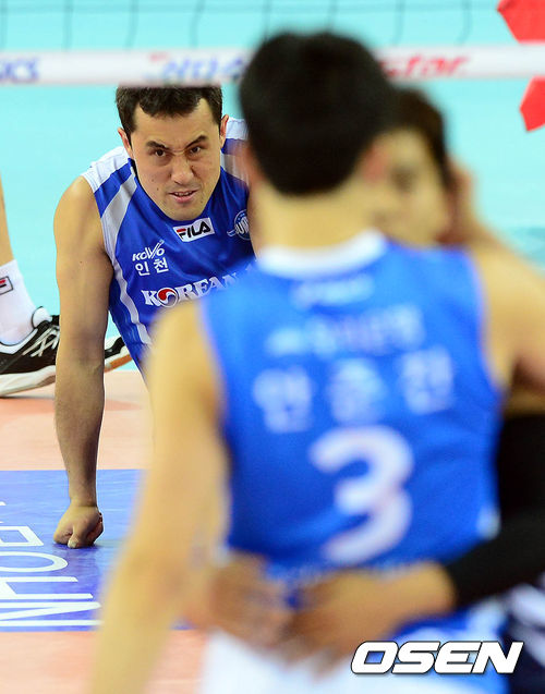 16일 오후 인천계양체육관에서 열린 '2013-2014 NH농협 V리그' 남자부 대한항공과 우리카드의 경기 2세트 우리카드가 득점 하자 최부식이 아쉬운 표정을 짓고 있다.
