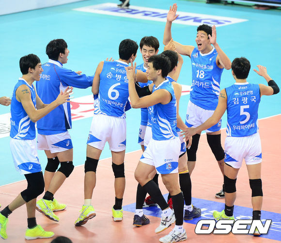 우리카드는 16일 인천계양체육관에서 열린 NH농협 2013-2014시즌 V리그 남자부 대한항공과 원정 경기서 세트 스코어 3-1(25-20, 25-18, 16-25, 25-14)로 완승을 거뒀다.