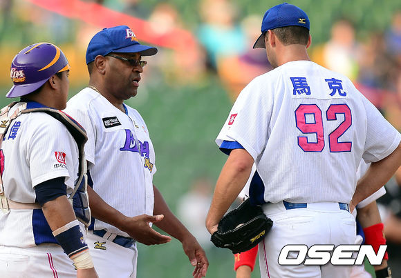 9회초 2사 2루 대만 EDA 라이노스 댈러그 윌리엄스 감독이 마운드에 올라 투수 교체를 하고 있다.
