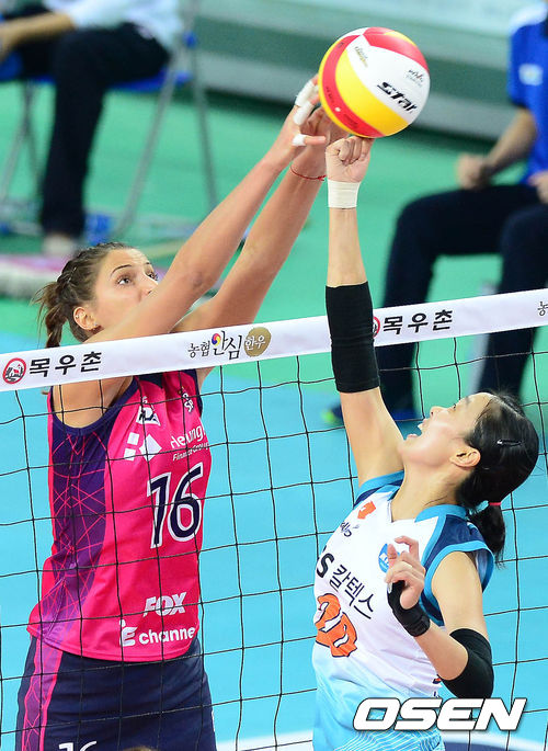 16일 오후 인천계양체육관에서 열린 '2013-2014 NH농협 V리그' 여자부 흥국생명과 GS칼텍스의 경기 2세트 바실레바와 정지윤이 볼경합을 벌이고 있다.