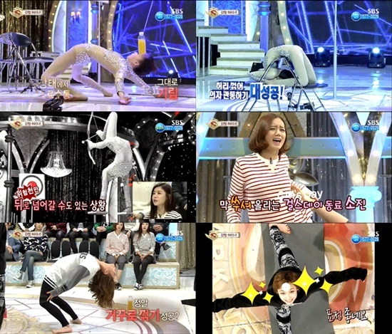 민과 페이는 16일 오후 방송된 SBS 예능프로그램 '놀라운 대회 스타킹'(이하 스타킹)에서 놀라운 유연성을 소유한 '세계에서 가장 단단한 허리의 소유자' 강철허리녀에게 도전장을 내밀었다.