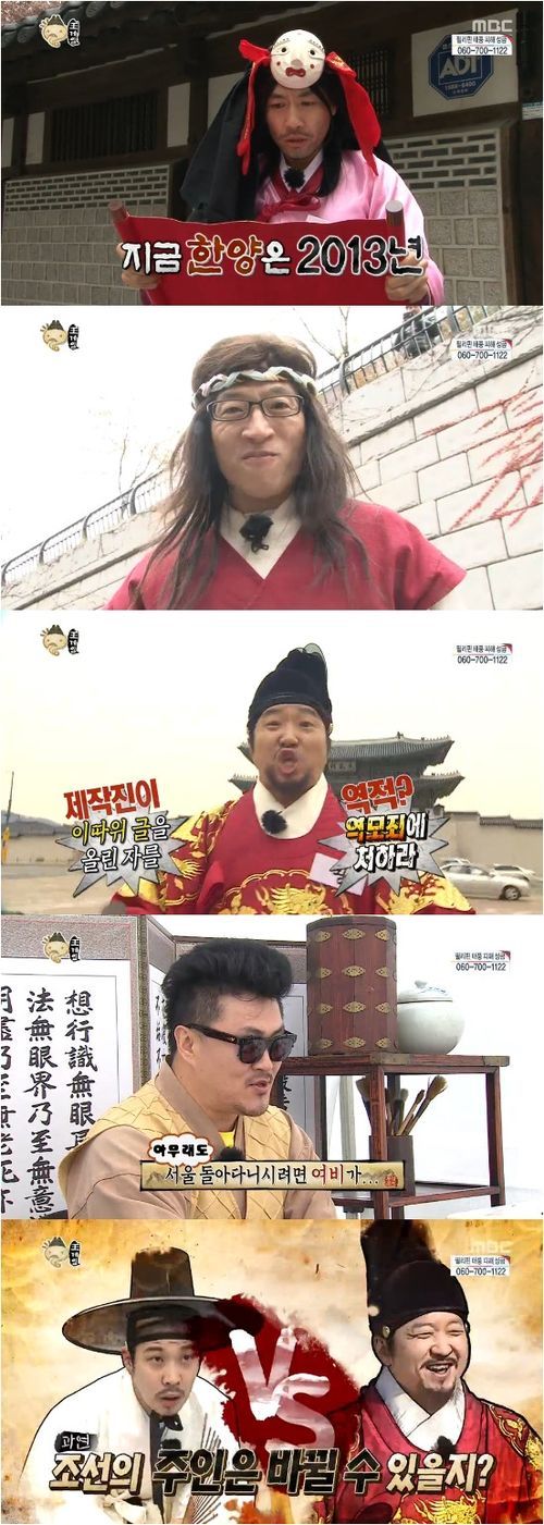 가장 먼저 신분 상승을 한 사람은 중인이었던 박명수였다. 박명수는 양반인 하하의 머리에 박을 치며 신분을 탈취했다. 하지만 박명수는 곧이어 중인인 정준하에게 신분을 빼앗겼다. 멤버들이 서로의 신분을 빼앗고 뺏기는 과정은 기존의 추격전과 다름이 없었지만 시간 이동이라는 상황 설정은 지루할 빌미를 내주지 않았다. 여기에 멤버들의 신분 탈취를 돕는 데프콘까지 더해지며 예측할 수 없는 대결이 시작됐다. 왕 정형돈이 휴대전화가 있는 천민을 잡아서 정보원으로 활용할 계획까지 세우며 치밀한 전략 대결이 예고됐다.