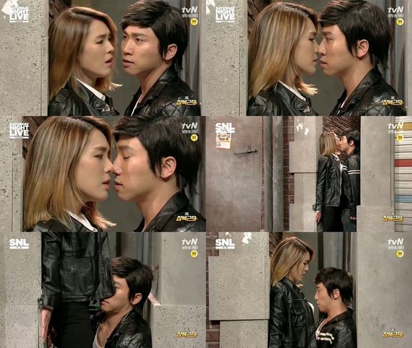가희와 유세윤은 16일 오후 방송된 tvN 'SNL 코리아' 속 '잠복근무' 코너에서 보기만 해도 아찔한 19금 스킨십으로 시선을 모았다.