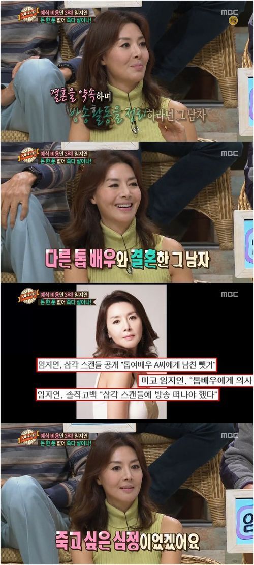 이날 임지연은 새로운 남자를 만나 결혼하는 과정에서 3억 원의 비용을 썼다고 말했다. 1980년대에 3억원이라는 돈은 정말 큰 돈이었다. 임지연은 1회 출연료가 6만5000원일 때였다고 부연했다.