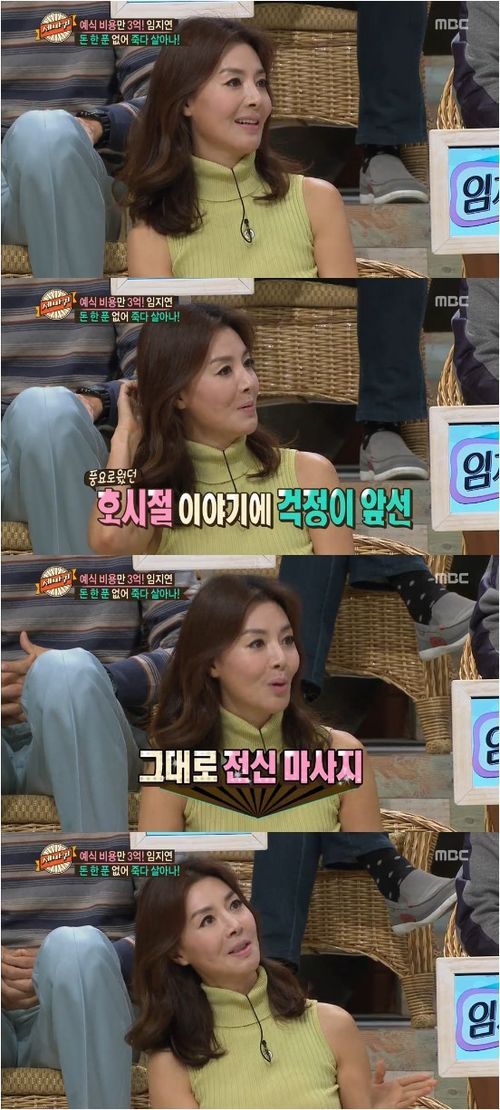 임지연은 “결혼 후 집으로 마사지 하는 분이 2~3명이 왔다. 다이아몬드 가루가 있다. 잘게 가공해서 전신 마사지를 하고 입욕제를 했다. 자연 탄소 성분이 몸에 좋다고 해서 마사지를 받았다”고 말했다.