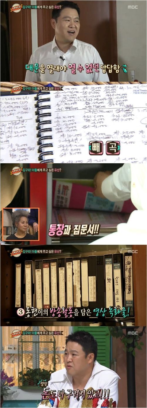 김구라는 “세탁소에 옷을 맡겼다가 잃어버린 적이 있어서 기록하고 있다”고 설명했다. 또한 출연료 회수를 파악하기 위해 통장까지 모은다는 사실과 아들 김동현이 출연하는 방송을 모두 녹화했다는 것도 고백했다. 이날 김구라의 집은 소박한 인테리어와 함께 그의 꼼꼼한 성격이 가장 눈에 띄었다.