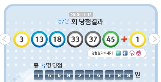 572회차 당첨 번호는 11월 16일 추첨 결과 3,13,18,33,37,45였다. 2등 보너스 번호는 1번이다.