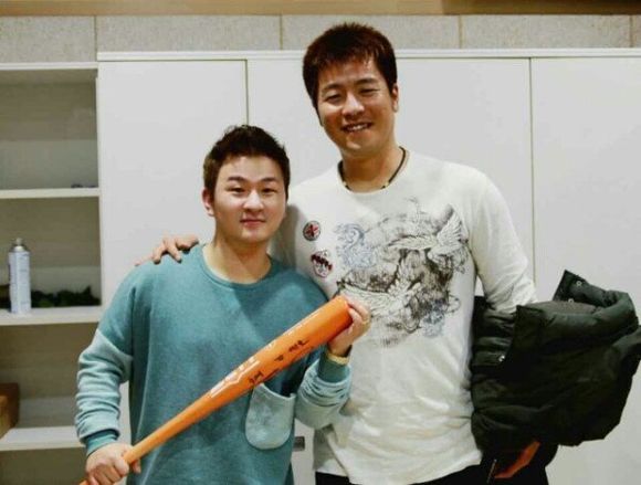 사진 속에서 허각은 강민호에게 선물 받은 듯한 주황색의 야구배트를 들고 강민호와 다정한 포즈를 취하고 있다.