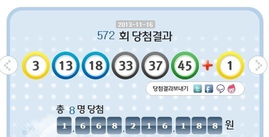 [OSEN=이슈팀] 11월 세째주 행운의 주인공은 8명이었다. 로또 572회차 당첨 번호가 발표됐다. 당첨번호 6개를 모두 맞힌 1등은 8명으로 1인당 16억 6800만 원씩의 당첨금을 받게 된다.
