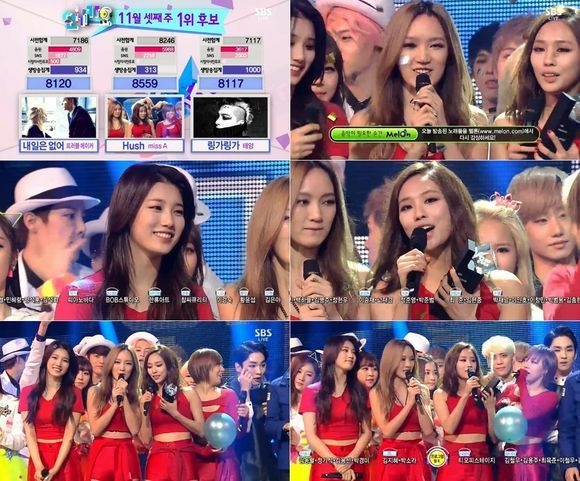 미쓰에이는 17일 오후 방송된 SBS '인기가요'에서 '허쉬'로 1위 후보에 오른 트러블메이커 '내일은 없어', 태양 '링가링가'를 제치고 1위를 차지하는 기염을 토했다.
