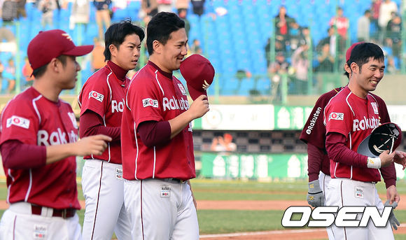 승리를 거둔 라쿠텐 선수들이 기뻐하고 있다.