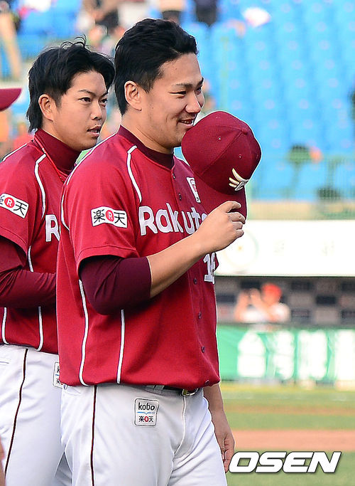 승리를 거둔 라쿠텐 다나카가 즐거운 미소를 짓고 있다.
