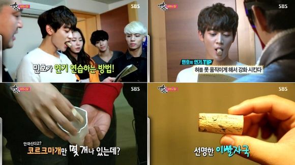 민호는 17일 방송된 SBS 예능 프로그램 '일요일이 좋다-맨발의 친구들'에 출연해 연기 연습 방법을 공개했다. 그는 "코르크마개를 물어 혀를 못 움직이게 해서 발음을 강화한다"며 직접 시범을 보였다.