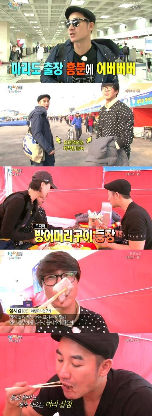 엄태웅과 성시경은 17일 오후 방송된 KBS 2TV 예능프로그램 '해피선데이-1박2일'에서 다른 출연자들보다 먼저 마라도로 떠났다. 두 사람은 제작진의 제약 없이 사비로 마라도의 음식을 마음껏 먹었다.