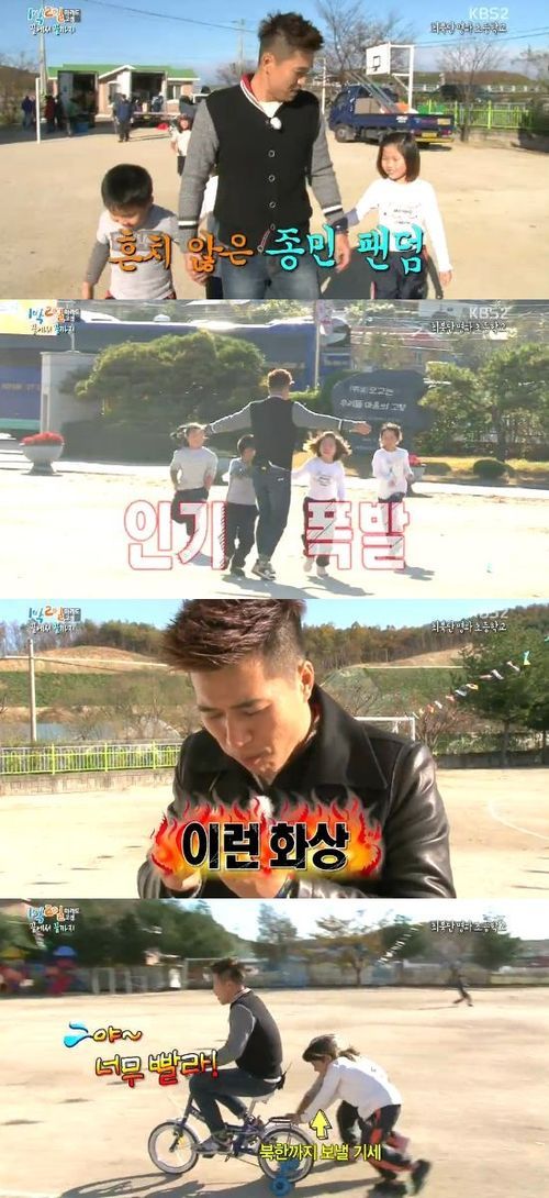 김종민은 "운동회 때 누구와 짝하고 싶냐"는 아이들의 말에 "나를 좋아해주는 사람"이라고 답했다. 그러자 아이들은 "팬이다"라면서 김종민의 옆에 모여들었다. 김종민은 아이들의 사랑에 힘입어 수적 우위를 점하며 축구 경기에 임했다.