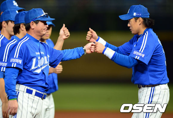 경기에 앞서 삼성 류중일 감독과 이승엽이 하이파이브를 하고 있다.