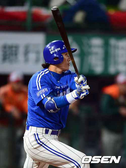 3회초 2사 1루 삼성 이승엽이 1타점 적시타를 때리고 있다.