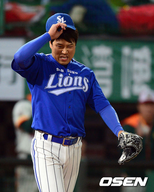 3회말 2사 1,3루 삼성 김희걸이 퉁이 천융지에게 역전타를 허용한 뒤 아쉬워하고 있다.
