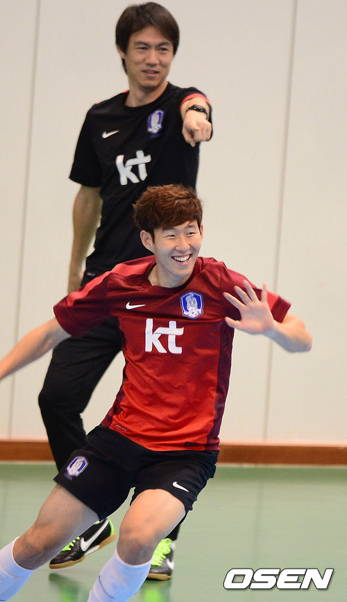 홍명보 감독이 훈련 도중 손흥민에 벌칙을 지적하고 있다.