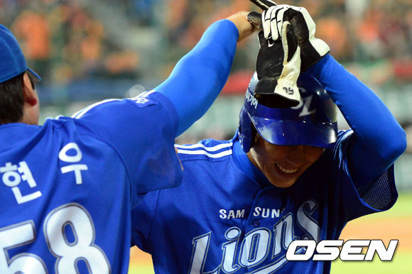 연장 10회초 2사 2루 삼성 박찬도가 우동균의 적시타로 득점을 올린 뒤 동료들에게 축하받고 있다./youngrae@osen.co.kr
