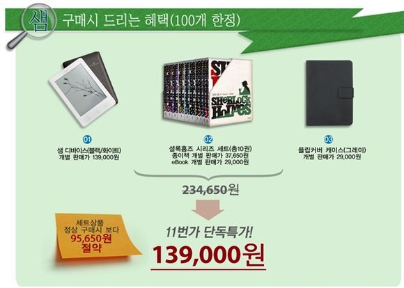 또 18일, 19일 이틀간 11번가 사이트에서 sam단말기와 셜록홈즈 시리즈(산호와진주) 10권의 종이책과 eBook 콘텐츠를 13만 9000원에 판매한다.