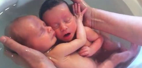 동영상 속 쌍둥이들은 엄마 뱃속을 나와 세상에 첫 고고성을 울린데 따뜻한 물에서 목욕을 하고 있다.
