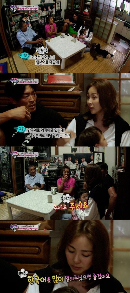 추성훈이 아내 야노 시호에게 “사랑이가 한국말을 조금씩 알아듣고 일본어로 대답한다”며 “한국어로 얘기하고 있는데 일본어로 대답하더라”라고 말했다. 사랑이의 할머니도 “주세요를 한국어로 말한다”고 전했다.