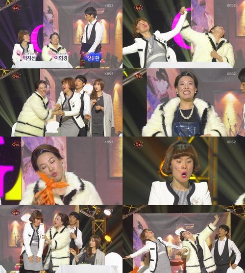 이날 방송에서는 수산시장 횟집으로 대박난 박지선과 이희경이 부를 누리기 위해 고급 일식집을 찾는 모습이 그려졌다. 이희경은 박지선에게 “생선 대가리는 잊어. 내장 갈라내는 것도 잊어. 우리가 얼마나 고생했니. 이제 우린 부자야. 이 부를 누려~”라고 말해 웃음을 자아냈다.