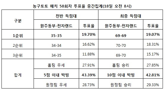 국민체육진흥공단(www.kspo.or.kr)이 발행하는 체육진흥투표권 수탁사업자 스포츠토토의 공식 온라인 발매사이트인 베트맨(www.betman.co.kr)이 19일 오후 7시 원주종합체육관에서 열리는 원주동부-전자랜드전을 대상으로 한 농구토토 매치 58회차 투표율을 중간 집계한 결과, 42.81%가 양 팀의 10점차 이내 박빙 승부를 예상했다고 전했다.