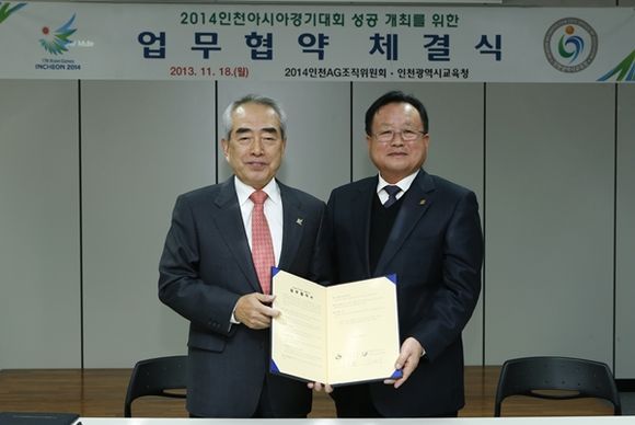 2014인천아시아경기대회조직위원회와 인천광역시 교육청이 대회 기간 활동할 통역요원 참여와 자원봉사 활성화를 위한 업무협약을 체결했다.