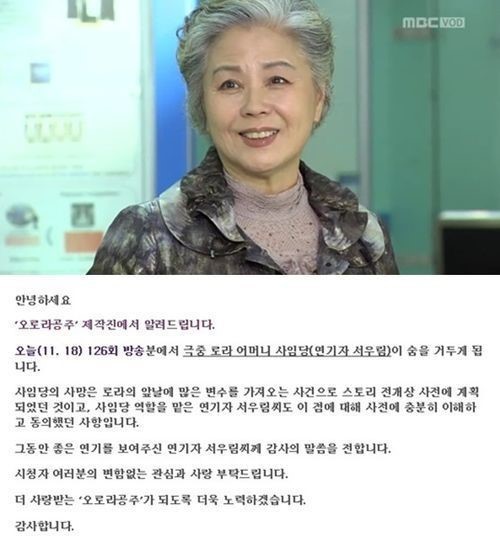 '오로라 공주'의 측은 18일 오전 해당 홈페이지에 이날 방송되는 126회분에서 극 중 로라(전소민 분) 어머니 사임당(연기자 서우림)이 숨을 거두는 모습으로 하차한다는 사실을 밝혔다.
