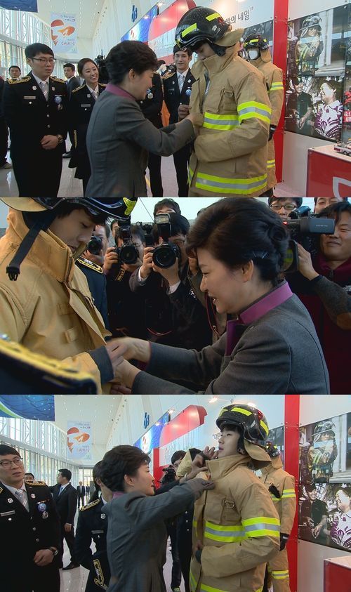 최우식은 대통령 앞에서 방화복 입기를 직접 시연하는 도중 지퍼가 말을 듣지 않자 “대통령님, 이 지퍼 좀 봐주시겠어요?”라고 말했고 박근혜 대통령은 센스를 발휘해 방화복 지퍼는 물론 목보호대까지 채워주며 최우식의 애교에 편안한 미소로 화답했다.