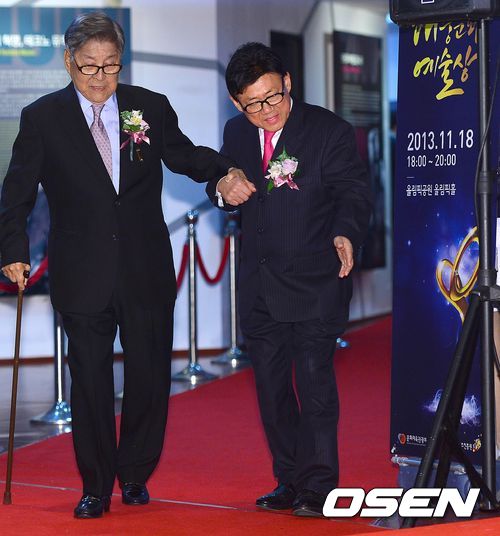 18일 오후 서울 방이동 올림픽공원 올림픽홀에서 열리는 '2013 대한민국 대중문화예술상' 시상식을 앞두고, 코미디언 구봉서와 엄용수가 포토타임을 갖기 위해 발걸음을 옮기고 있다.