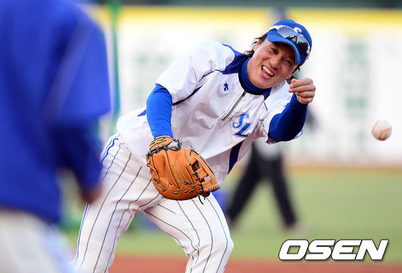 경기에 앞서 삼성 이승엽이 수비 훈련을 하고 있다.