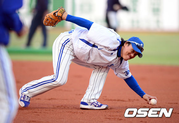 경기에 앞서 삼성 이승엽이 수비 훈련을 하고 있다.