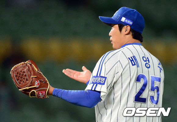 2회초 2사 1,2루 삼성 배영수가 호주 캔버라 버티에게 볼넷을 허용한 뒤 주심에게 어필하고 있다.