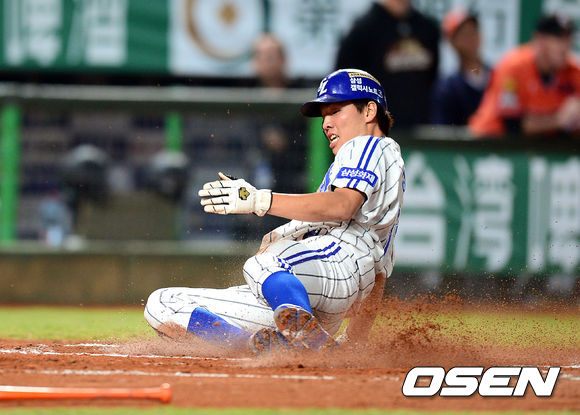1회말 무사 2루 삼성 정형식이 박한이의 적시타때 득점을 올리고 있다.