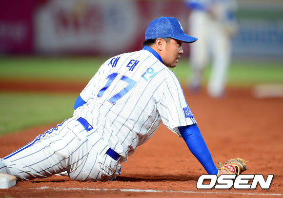 3회초 2사 삼성 채태인이 호주 캔버라 크루즈의 3루수 땅볼때 삼성 박석민의 송구 실책으로 포구를 하지 못한 뒤 공을 바라보고 있다.