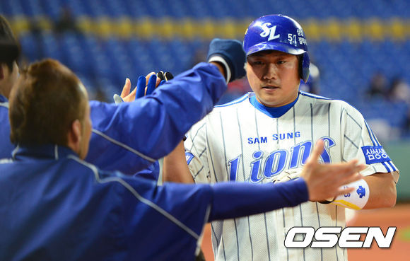 3회말 1사 2,3루 삼성 이지영이 박한이가 우익수 희생플라이로 득점을 올린 뒤 동료들과 기뻐하고 있다.