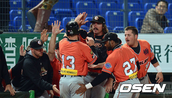 4회초 무사 2루 호주 버티의 적시타때 오피츠가 득점을 올린 뒤 동료들과 기뻐하고 있다.