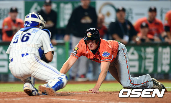 4회초 무사 1,2루 호주 캔버라 데닝이 프롤리의 내야 땅볼때 삼성 유격수 정병곤의 실책으로 홈에 들오다 아웃당하고 있다.