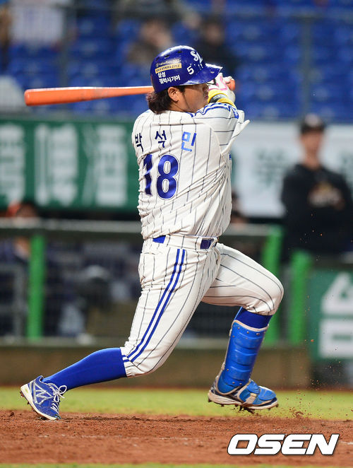 5회말 1사 만루 삼성 박석민이 2타점 내야 안타를 때리고 있다.