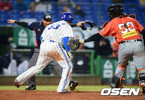 5회말 1사 만루 삼성 박한이가 박석민의 내야 땅볼때 홈으로 쇄도해 득점을 올리고 있다.