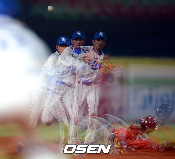 7회초 1사 1루 삼성 강명구가 머피의 내야 땅볼때 1루 주자를 포스아웃으로 잡아낸 뒤 1루로 송구하고 있다.