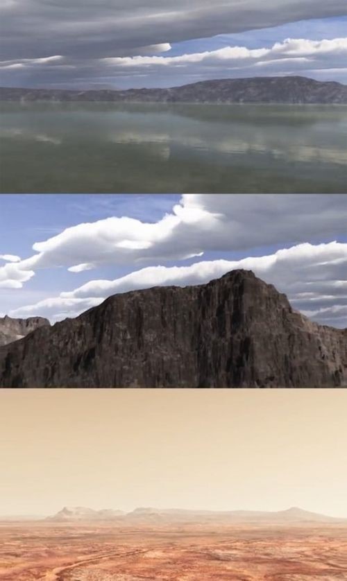 40억년 전 화성은 푸른 하늘과 구름, 그리고 바다 등이 존재했다. 흡싸 지구와 비슷한 모습이다. 그러나 시간이 지날수록 물이 말라가면서 대기는 푸른빛이 아닌 황토색으로 변했다. 결국 물은 모두 말랐고, 우리가 알고 있는 모래만이 존재하는 화성으로 변한다.