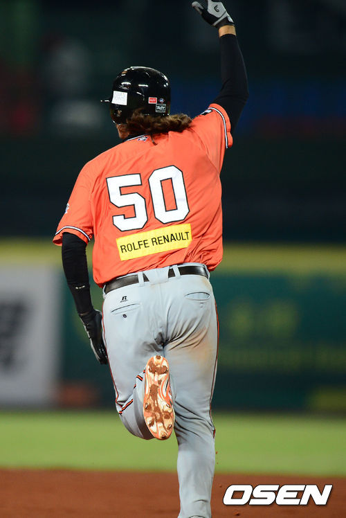 연장 10회초 1사 1사 캔버라 머피가 삼성 안지만에게 투런 홈런을 뽑아낸 뒤 그라운드를 돌고 있다.