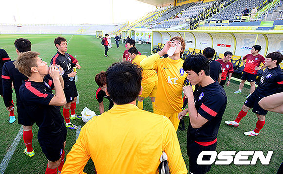 훈련에 앞서 대표팀 선수들이 목을 축이고 있다.