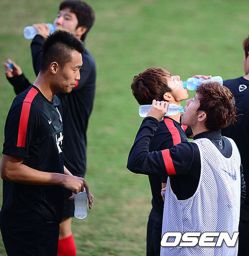 훈련도중 김신욱, 손흥민이 물을 마시고 있다.
